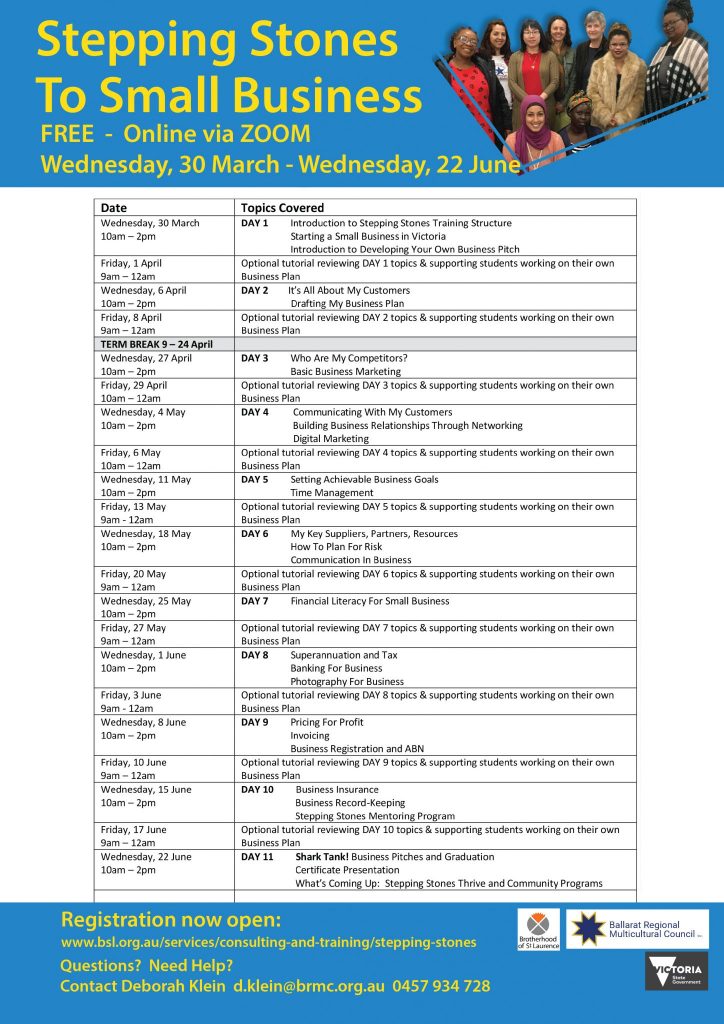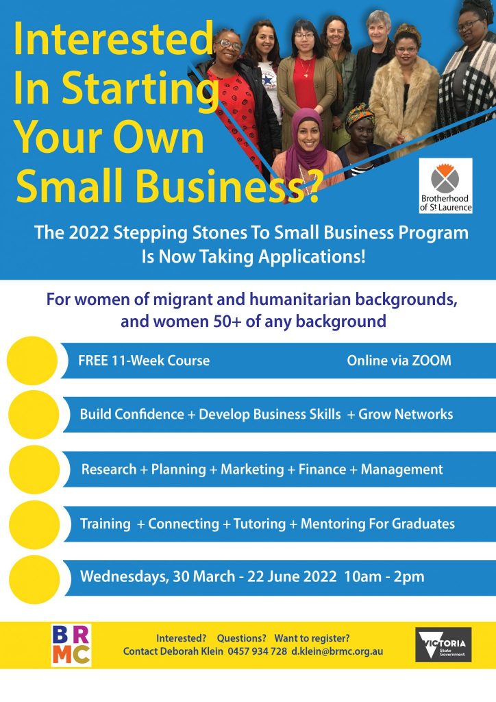 Registrations are open for the Stepping Stones to Small Business training program, starting Wednesday 30 March, 10am – 2pm and running each Wednesday to 22 June (with a break for the Term 1 School Holidays). FREE and online, Stepping Stones is open to all women of migrant and humanitarian backgrounds, and to women 50+ of any background.