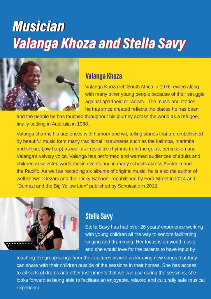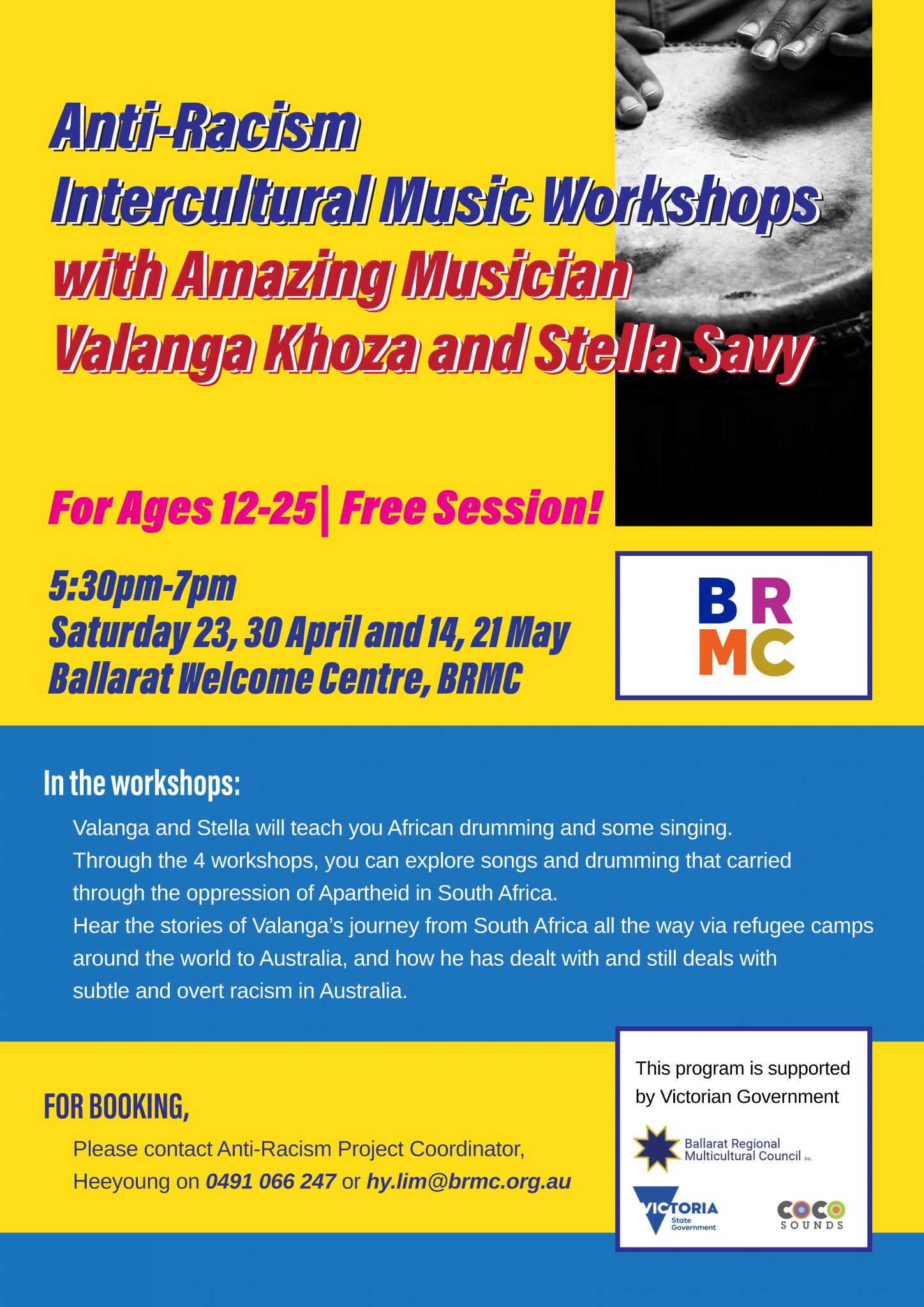 BRMC will provide amazing music workshops with professional musicians Valanga Khoza and Stella Savy. Participants aged 12-25 will have the opportunity to learn drumming and singing. In addition, musician Valanga will share the racism he has experienced during his life as an African-Australian with a refugee background and lived story of overcoming racism. Multicultural teenagers and young people participating in the workshop will have time to express their experiences through music, and share racism they have experienced in school or society with others.