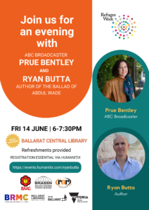 Join the Ballarat Regional Multicultural Council, the Ballarat Library, the Ballarat Afghan Action Group, the Ballarat Refugee and Asylum Seeker Support Network, and Ballarat Rural Australians for Refugees in welcoming Ryan Butta, author of The Ballad of Abdul Wade, to Ballarat. ABC Broadcaster Prue Bentley and author Ryan Butta will discuss the themes in his recently published book, exploring the incredible true story of Australia’s unsung pioneering heroes – the Afghan cameleers.