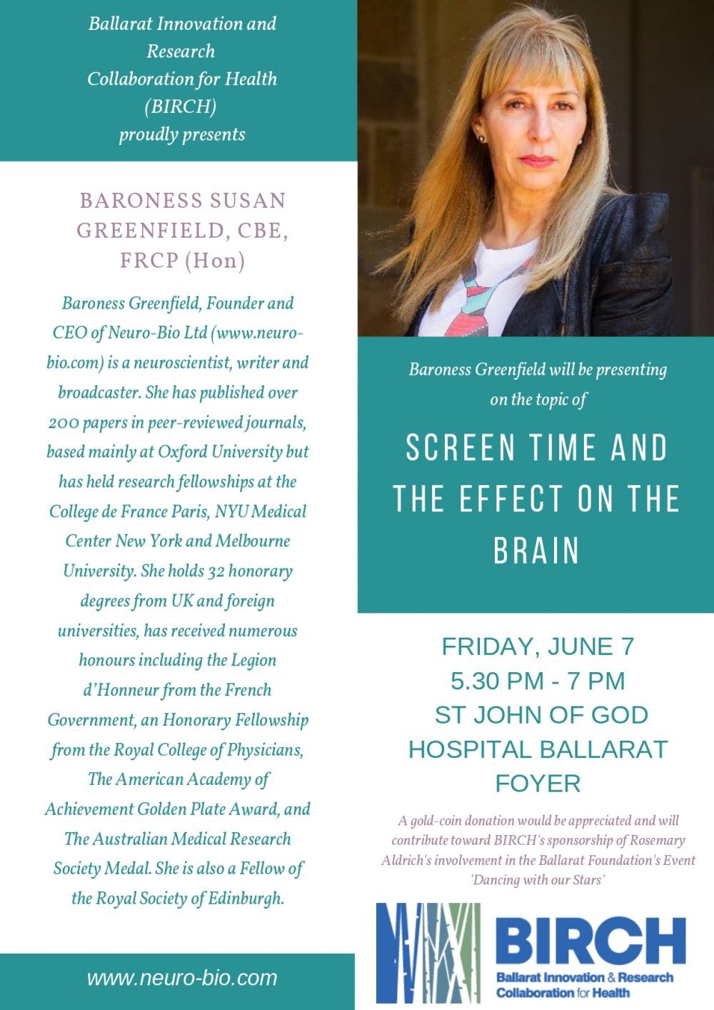 Free public presentation “Screen time and the effect on the brain” presented by Baroness Susan Greenfield.