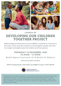 BRMC invites you to our launch of the Developing Our Children Together project. Thursday 10th December, 10.30am - 11.30am Barkly Square Courtyard, 25-39 Barkly St, Ballarat Developing Our Children Together…