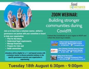 Learn how a volunteer mentor, skilled in governance, can partner with your committee or board to help your organisation. Attendees will be eligible for 1:1 session(s) with experienced volunteer mentors…
