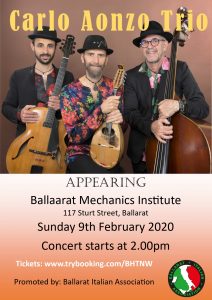 Carlo Aonzo will be appearing at the Ballaarat Mechanics Institute on Sunday 9th February with accomplished guitarist, Lorenzo Piccone and double bass player Luciano Puppo. CARLO AONZO is a world…