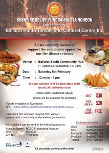 This event has been organised by Ballarat Hindu Temple and Cultural Center (BHTCC) to support bushfire victims. All profits raised through this event will be sent towards bushfire relief. Enjoy…