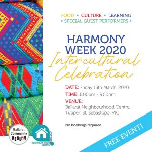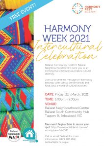 Ballarat Community Health and Ballarat Neighbourhood Centre invite you to an evening that celebrates Australia's cultural diversity. Join us to send the message of 'everybody belongs' with special performances and…