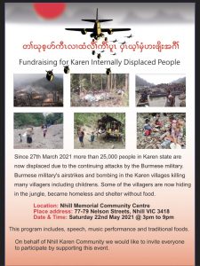 Nhill Karen Community invites you to attend this important fundraising event for Karen Internally Displaced People. Program includes speeches, music performances and traditional food.