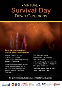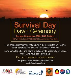 The Koorie Engagement Action Group (KEAG) invites you to join virtually for Ballarat's second Survival Day Dawn Ceremony. The ceremony will be livestreamed from View Point, Lake Wendouree. Let's watch…