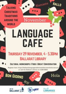 November Language Cafe - the last one of the year! Talking Christmas traditions around the world. Register here: https://ballaratlanguagecafenovember.eventbrite.com.au/