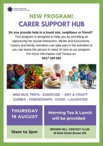 BRMC Social Support will be launching our new program Carer Support Hub. Special guests include our brilliant local artist Melinda Muscat and the very talented Stella Savy. Carer Support Hub…